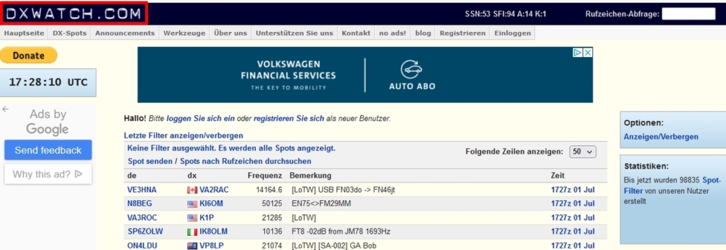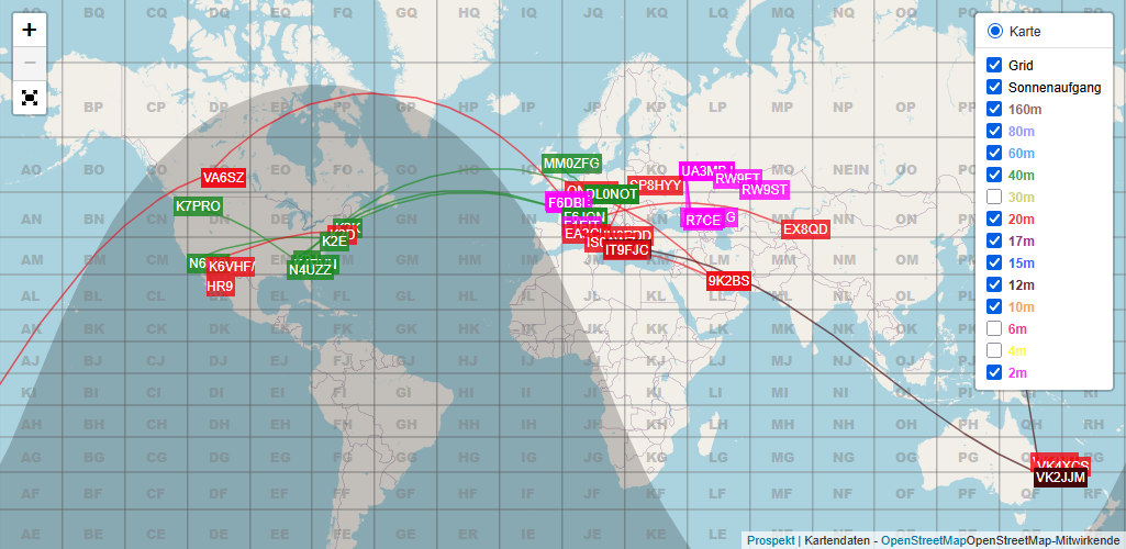 – welcher Funkamateur | zu welcher Zeit | welches Funkrufzeichen | auf welcher Frequenz – (QRV – betriebsbereit) ist | bzw. gehört hat.